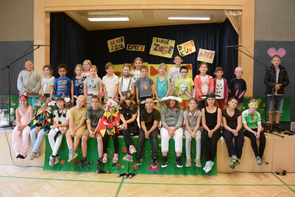 Neben einer gelungenen Weihnachtsaufführung waren wir das gesamte Schuljahr mit dem Musical „Als die Tiere die Schimpfwörter leid waren“ beschäftigt. Neue Lieder und Schauspielstücke wurden gelernt und Kostüme und Kulissen gebastelt bzw. gemalt. Die Aufführung war ein großer Erfolg und wir bekamen riesigen Applaus.
