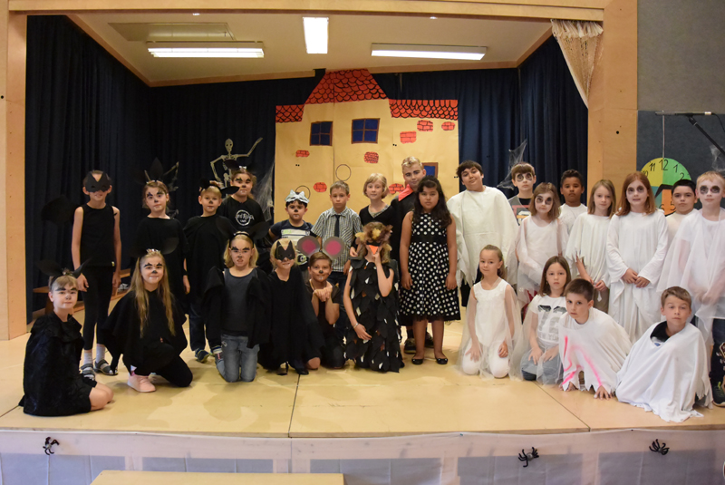 Nach einer gelungenen Weihnachtsaufführung widmeten wir uns in der Unverbindlichen Übung „Musikalisches Gestalten“ dem Musical „Villa Spooky„. Wir lernten die Lieder, studierten die Texte und Schauspielstücke ein und bastelten Kostüme und Kulissen. Die Aufführung war wieder ein voller Erfolg und wir sahen richtig gruselig aus!